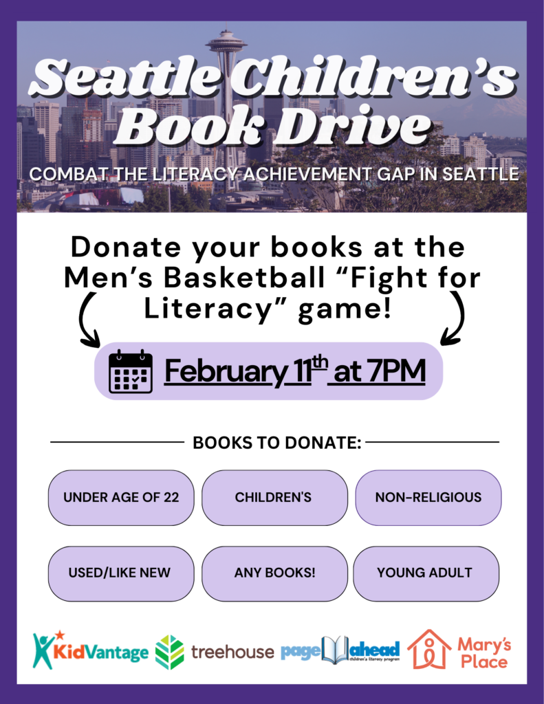 UW Athletics is hosting a book drive on February 11th in their “Fight for Literacy” game against Penn State at 7PM at Alaska Airlines Arena. Collection bins will be ready at each entrance to the arena.